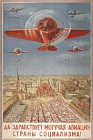 "Drum höher und höher und höher, wir steigen trotz Haß und Hohn. Ein jeder Propeller singt surrend (das Lied): Wir schützen die Sowjetunion. "